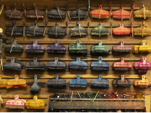 開業当初は藍染を中心に染物を行っておりましたが合成染料の発達により「刷毛引き本染め」の技法を取り入れ、現在では色彩鮮やかな大漁旗や袢天(はっぴ)等の染めを行っております。